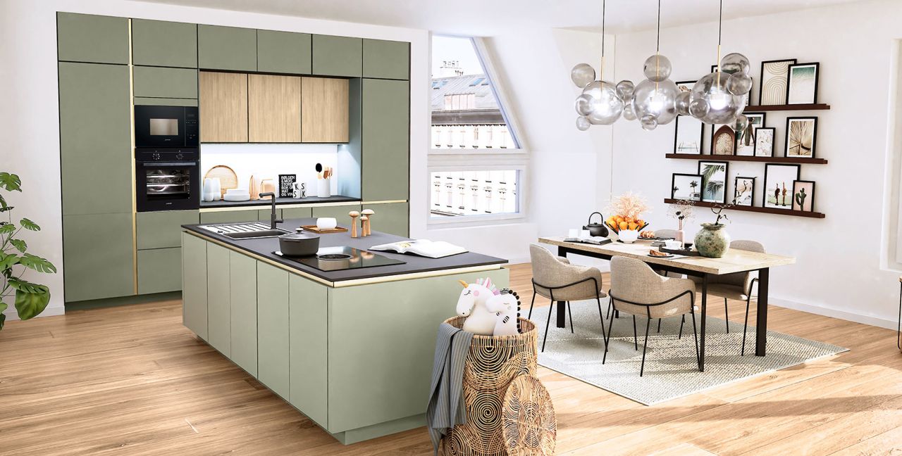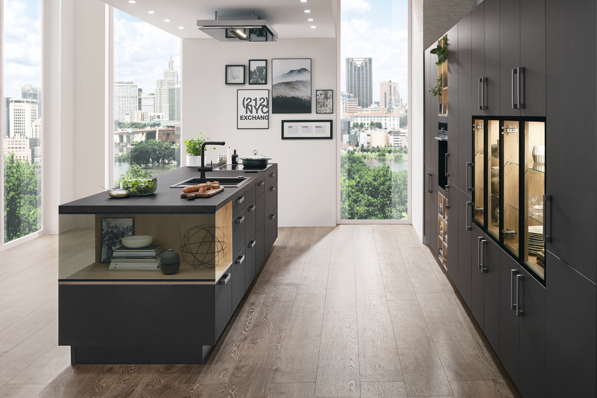 Inklusive Einbaubackofen schwarz Siemens HB234ABB3 Energieeffizienzklasse A+, Glaskeramik Kochfeld mit Induktion und Kochfeldabzug (Umluft) Bora GP4U, Kühlschrank Laurus LKG88E Energieeffizienzklasse E, Mikrowelle Junker JP4119260, Einbau-Designspüle Elleci Logik 300, XL-Schränken, Unterschrank mit Großraumauszügen, Wandschränken mit Klappe.