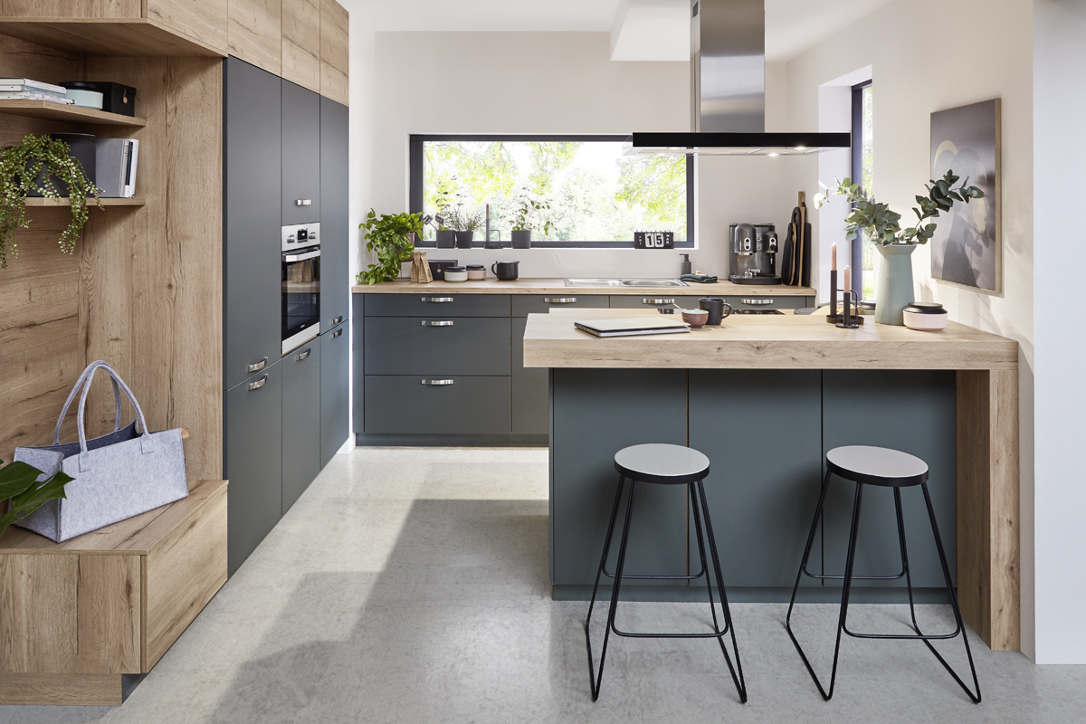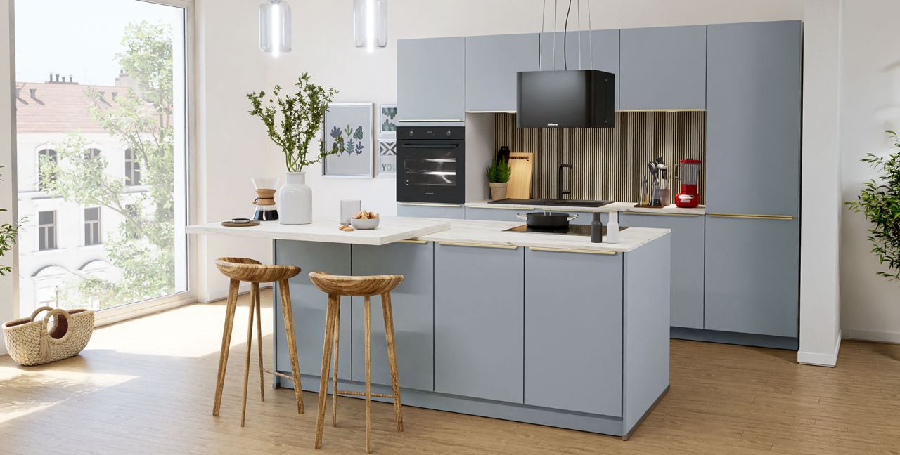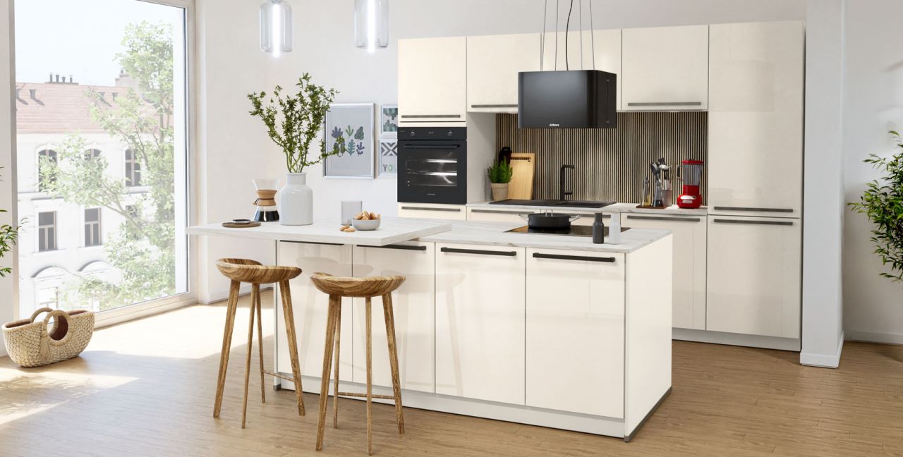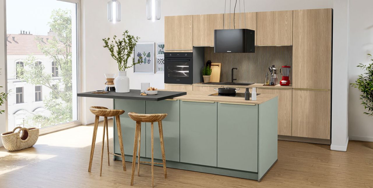 Inklusive Einbaubackofen Laurus LEB10BK Energieeffizienzklasse A, Glaskeramik Kochfeld Laurus LCA600, Inselesse Schwarz Airforce SharpBLF45 Energieeffizienzklasse A, Kühlschrank Laurus LKS88E Energieeffizienzklasse E, Einbau-Designspüle Elleci Logik 300, XL-Schränken, Essplatz.